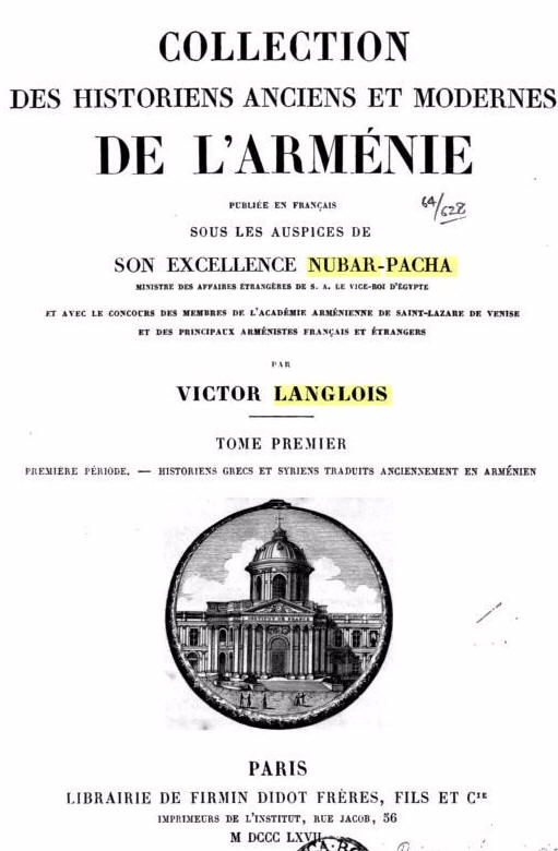 MAR APAS CATINA.HISTOIRE ANCIENNE DE L’ARMÉNIE,EXTRAITE DE L’HISTOIRE DES PREMIERS ANCETRES, TRADUITE DU CHALDÉEN EN GREC PAR ORDRE D’ALEXANDRE LE GRAND, ET CONSERVEE EN PARTIE PAR MOÏSE DE KHORÈNE. TRADUCTION NOUVELLE EN FRANÇAIS AVEC DES NOTES HISTORIQUES, CRITIQUES ET PHILOLOGIQUES, par VICTOR LANGLOIS.