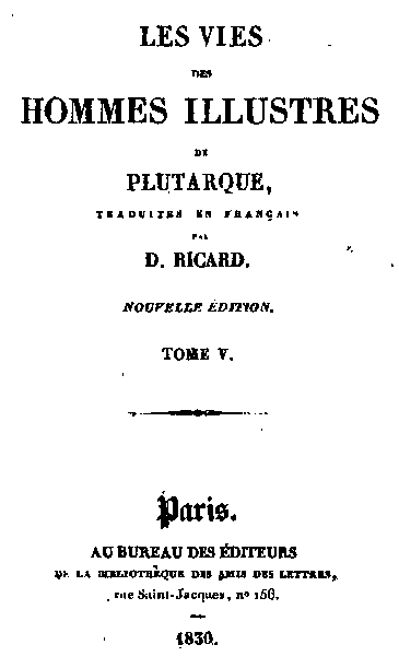 Relu et corrigé Dominique RICARD, Les Vies des Hommes illustres par Plutarque, t. V, Paris, AU BUREAU DES ÉDITEURS DE LA BIBLIOTHÈQUE DES AMIS DES LETTRES. rue Saint-Jacques, n° 137, 1829.