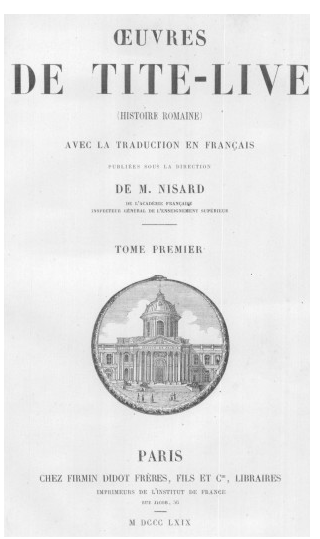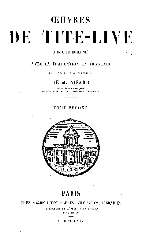 1-2 PREFACE 3-72 LIVRE PREMIER SOMMAIRE. - Descente d'Énée en Italie; ses exploits.— Règne d'Ascagne à Albe, et des Silvius ses successeurs. — La fille de Numitor, surprise par Mars, devient mère de Romulus et de Remus. — Meurtre d'Amulius. — Fondation de Rome. — Établissement du sénat. — Guerre contre les Sabins.— Consécration de dépouilles opimes à Jupiter-Feretrien. — Division du peuple en curies. — Défaite des Fidenates et des Véiens. — Apothéose de Romulus. — Numa Pompilius institue les cérémonies religieuses; élève un temple à Janus; fait la paix avec tous les peuples voisins, et ferme, le premier, les portes de ce temple. A la faveur des entretiens nocturnes qu'il feint d'avoir avec la nymphe Égérie, il inspire à ce peuple farouche des sentiments religieux. — Tullus Hostilius porte la guette chez les Albains. — Combat des Horaces et des Curiaces. — Horace absous. — Supplice de Vettius Suffetius. — Ruine d'Albe; incorporation de ses habitants dans Rome. —Guerre déclarée aux Sabins. — Tullus périt frappé de la foudre. — Ancus Marcius renouvelle les cérémonies instituées par Numa; il défait les Latins, leur donne droit de cité, et leur assigne le mont Aventin pour demeure. Seconde prise de Politorium, ville du Latium, dont les anciens Latins s'étaient emparés, et ruine de cette ville. Ancus jette un pont de bois sur le Tibre; unit le mont Janicule à la ville, et recule les frontières de son empire; bâtit Ostie, et meurt après un règne de vingt-quatre ans. Sous son règne, Lucumon, fils du Corinthien Démarate, vient de Tarquinie, ville d'Étrurie, à Rome; admis dans l'intimité d'Ancus, il prend le nom de Tarquin, et monte sur le trône après la mort d'Ancus. Il augmente de cent le nombre des sénateurs; soumet les Latins; trace l'enceinte du cirque, et institue des jeux. Attaqué par les Sabins, il augmente les centuries des chevaliers. Pour mettre à l'épreuve la science de l'augure Attius Navius, il lui demande si ce qu'il pense dans le moment est possible, et, sur sa réponse affirmative, il lui ordonne de couper un caillou avec un rasoir, ce que l'augure fait sur-le-champ. — Défaite des Sabins; Rome entourée de murailles; construction des égouts. —Tarquin est assassiné par les fils d'Ancus après un règne de trente-huit ans. — Il a pour successeur Servius Tullius, fils d'une noble captive de Corniculum : la tradition rapporte que dans son enfance ou avait vu, dans son berceau, des feux briller autour de sa tète ; défaite des Veiens et des Étrusques. Établissement du cens, qui porte, dit-on, à quatre-vingt mille le nombre des citoyens. Cérémonie du lustre. Division du peuple par classes et par centuries. Le roi recule le Pomaerium, pour réunir à la ville les monts Quirinal, Viminal et Esquilin. De concert avec les Latins, il élève un temple à Diane sur le mont Aventin. — Il est tué par L. Tarquin, fils de Priscus, à l'Instigation de sa fille Tullie, après un règne de quarante-quatre ans. A sa mort, L. Tarquin le Superbe, sans l'aveu du sénat ni du peuple, s'empare du trône : le jour de l'usurpation, l'infâme Tullie fait passer son char sur le corps de son père. Tarquin s'entoure de grandes armées pour la sûreté de sa personne. Turnus Herdonius périt victime de sa perfidie. Tarquin fait la guerre aux Volsques, et de leurs dépouilles élève un temple a Jupiter dans le Capitole. Le dieu Terme et la déesse de la Jeunesse résistent à la destruction, et leurs autels restent debout dans le nouveau temple. La ruse de Sextus Tarquin, son fils, met en son pouvoir la ville des Gabiens. Ses fils se rendent à Delphes, consultent l'oracle pour savoir auquel d'entre eux doit obtenir la couronne : l'oracle répond que celui-là régnera qui donnera le premier baiser à sa mère. Ils se méprennent sur le sens de l'oracle; Junius Brutus qui les avait accompagnes se laisse tomber comme par mégarde, et baise la terre : l'événement ne tarde pas à justifier son interprétation; en effet, la tyrannie de Tarquin le Superbe ayant soulevé la haine générale, son fils Sextus y met le comble en ravissant l'honneur à Lucrèce qu'il avait surprise la nuit par la violence; celle-ci fait appeler Trisipitinus son père, et Collatin son mari, et se poignarde sous leurs yeux après leur avoir fait jurer de ne pas laisser sa mort sans vengeance. Ce serment s'accomplit, grâce aux efforts de Brutus surtout. Après un règne de vingt-cinq ans Tarquin est chassé. — Création des premiers consuls, L. Junius Brutus et L. Tarquimus Collatin. 759-788 partim NOTES SUR LE LIVRE I 73-109 LIVRE DEUXIÈME. SOMMAIRE. — Brutus fait jurer au peuple qu'il ne souffrira plus de roi dans Rome; il force Tarquin Collatin, son collègue, devenu suspect comme parent des Tarquins, à abdiquer le consulat et à sortir de la ville; il livre au pillage les biens de la famille royale, consacre à Mars le terrain appelé depuis Champ-de-Mars; fait frapper de la hache de jeunes patriciens, ses fils mêmes et ceux de son frère, qui avaient conspiré pour rétablir les Tarquins; il donne la liberté à leur dénonciateur, l'esclave Vindicius, et de là vient le mot de vindicte. Il conduit l'armée contre les princes, qui venaient faire la guerre à Rome avec les troupes réunies de Veies et de Tarquines; il périt dans le combat avec Aruns, fils de Tarquin-le-Superbe. Les dames romaines portent son deuil pendant un an. — Le consul Valerius fait passer une loi qui consacre le droit d'appel au peuple. — Dédicace du Capitole. — Porsenna, roi de Clusium, s'arme en faveur des Tarquins, et s'avance jusqu'au Janicule; mais la bravoure d'Horatius Codés l'empêche de traverser le Tibre : Horatius, pendant qu'on coupe derrière lui le pont de bois, soutient seul le choc des Étrusques, et quand le pont est rompu se jette tout arme dans le lieuse et rejoint les siens à la nage. — Un autre exemple de courage est do