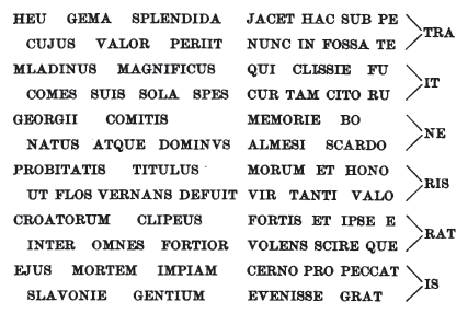 « L'Épitaphe du prince Mladin III de Bribir du XIVe siècle, par la maîtrise de la langue et l'achèvement de la forme, montre l'évolution considérable de la langue poétique latine en Croatie. » Cf. Antoine Pinterović, La littérature croate du moyen-âge.