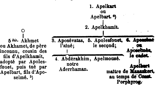 [1] Voici les notes de M.-F. Brosset, historien du XIXe siècle, spécialiste de la Géorgie et de l’Arménie, sur le chapitre concerné, elles proviennent du Bull. de l’Académie des sciences de St Pétersbourg, 1863 : « Constantin Porphyrogénète nous donne des renseignements très précis sur la contrée où les Arméniens placent les possessions des Caïsics, i. e. l'Apahounik (ce canton est limitrophe et au S. de l'Archarounik, ci-dessus mentionné). Suivant lui, dès avant Achot, —le Brave, le Carnivore (Achot fut prince d'Arménie de 780 à 820) — père de Sembat-le-Confesseur, qui mourut en 856, à Dovin, Bercri, Khaliat ou Akhlat et Arsès ou Ardjech, villes au N. du lac de Van, étaient sous la domination des Persans, par où il faut entendre les musulmans et notamment nos Caïsics, d'après les témoignages arméniens cités plus bas, qui se rapportent à la même époque. Achot reprit ces villes, ainsi que Tibé ou Dovin, Khert et Salamas. Sous ce même Achot, la ville et le territoire de Mandzikert ou plutôt Manazkert, sur le Mourad-Tchaï, à l’O. du lac de Van, appartenaient à un musulman, que le royal auteur nomme, à deux lignes de distance, Apelkart et Apelbart, et le prince arménien lui donna les trois villes d'Akhlat, d'Ardjech et de Bercri. La descendance de ce personnage peut être ainsi figurée, d'après le dire de Const. Porphyrogénète: le N° mis avant le nom indique l'ordre de succession de l'autorité dans la famille, tel qu'il est donné par l'historien.