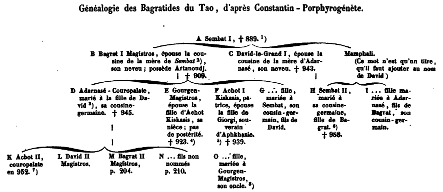 [25] Arzen est un mot arabe, qui signifie terre, pays : de là s'est formé lé nom d'Arzen - er - Roum ou Arzroum. Il me semble qu'il est pris ici dans son sens étymologique, autrement il faudrait traduire « la contrée d'Artanoudj, ou Arzen, » i. e. le canton portant un tel nom. [26] Il y a ici une faute dans le texte grec; la suite fait bien voir que les trois titres de Protospathaire, Manglabite et Drongaire de la marine, se rapportent au patrice Constant. [27] Ce mot doit toujours s'entendre dans le sens de défunt. [28] C'est ici que les récits de Constantin deviennent plus embrouillés et plus inconciliables avec les dates assignées par les Annales au décès des princes Bagratides. En effet Romain Lécapène mourut en 944 ; ce prince veut conférer le magistrat à Gourgen, qui selon les Annales mourut en 923 ; Adarnasé mourut, selon la même autorité, en 915, mais suivant Constantin, il était déjà mort en 923, du vivant de Gourgen ; Dawith, frère d’Achot, qui était curopalate en 952, était déjà mort en 952, lorsque Constantin écrivait son livre, mais il vivait encore lorsque Gourgen allait être créé curopalate (donc avant 923) ; enfin l’envoyé de l’empereur dit à Dawith-Magistros, fils d’Adarnasé, qu’il veut aller trouver Dawith-Magistros. — Solution : le second Dawith ici mentionné doit être le Dawith-Mamphal d’Artanoudj, qui mourut, suivant les Annales, en 943 ; et de deux choses l’une : ou Gourgen, qui allait être promu au magistrat, ne mourut point en 923 comme le dit l'Annaliste, on c'était le fils homonyme du Gourgen que Constantin dit, p. 206, être mort sans postérité, mais que l’auteur géorgien dit être mort en 968. [29] Frère d’Achot qui était curopalate en 952. [30] On voit par le Tableau généalogique ci -joint que cet Adarnasé mourut, suivant les Géorgiens, en 945. [31] Ce doit être le frère de Bagrat Magistros, et fils comme lui de Sembat, mentionné p. â06 par Constantin Porphyrogénète. [32] Ce curieux fragment renferme tout ce que nous connaissons de l'histoire des Bagratides du Tao, parents de ceux qui ont régné en Géorgie depuis Achot Curopalate, en 787, jusqu'à la dernière année de Gourgen, roi des rois, en 1008. Durant cet espace de 221 ans nous trouvons, dans la branche régnante et dans une branche collatérale, sept générations; la seconde branche ne nous est connue que par son arbre généalogique, où sont seulement enregistrés deux faits, la filiation et la date de la mort des personnages; et quant à l'histoire proprement dite, elle se résume dans cette analyse de la situation des Bagratides du Tao, par Wakhoucht: « Or ces rois Bagratides géorgiens montaient, il est vrai, sur le trône de Karthli, mais quand ils étaient vaincus par leurs ennemis, ils se contentaient de la possession du Samtzkhé, ou Zémo-Karthli, du Tao, du Djawakheth, du Thrialeth, des éristhawats de Samchvvildé, et de Khounan, en exceptant le Gardaban. Ils avaient aussi dans le Clardjeth les domaines formant leur apanage, des forteresses et autres territoires, et parfois le Somkheth et le Chida-Karthli. Bagrat-Régwen eut le Basian, le Tao et les contrées environnantes. » Telle fut spécialement la destinée de Soumbat, à l’occasion duquel l’historien fait ces réflexions, et celle de son fils et successeur Bagrat-Régwen, en qui se termine la série des Bagratides du Tao, à laquelle succéda, jusqu'à nos jours, la dynastie Aphkhazo-Bagratide. Dans l'absence de tout renseignement géorgien sur cette portion de la famille Bagratide, nous sommes obligés d'admettre les récits de Constantin Porphyrogénète, témoin contemporain, ayant tous les moyens d'être bien informé, et dont le ton simple et naïf inspire au lecteur la plus grande confiance dans sa bonne foi. D'ailleurs il complète ce que nous savons par les Géorgiens, sans le contredire, hormis en ce qui concerne quelques points des généalogies ; et quant à ce qu'il rapporte des incroyables alliances des Bagratides du Tao, où l'on voit des frères devenir cousins germains par mariage, des oncles épouser leurs nièces, cet usage judaïque, dans un pays où la religion grecque était dominante, est véritablement quelque chose de caractéristique. Voici, du reste, les généalogies alléguées par Constantin Porphyrogénète, qu'il est facile de comparer avec celles dont les Annales donnent la série. Dawith & Spandiatès : issus du commerce du roi-prophète avec la femme d’Urie ; venus en Ibérie quatre ou cinq siècles avant la période où Constantin écrivait. Spandiatès meurt sans postérité. Dawith à Bagrat à Achot à Adarnasé, curopalate au temps de l’empereur Léon VI le Sage.