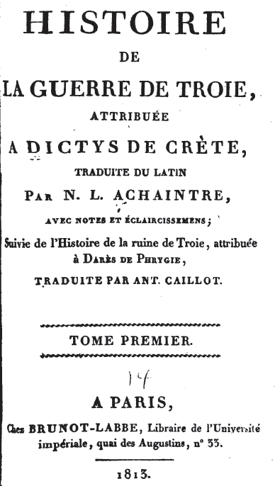 ARGUMENT DU LIVRE TROISIÈME. Les Grecs sont exercés pendant l'hiver. - Presque toutes les villes de l'Asie abandonnent le cause de Priam. - Amour d'Achille pour Polyxène. - On se bat de part et d'autre avec fureur. Achille est blessé. - Patrocle donne la mort à Sarpédon. - Il meurt dans le même combat. - Douleur d'Achille au sujet de la mort de son ami. - Idoménée est blessé. - Achille fait tomber sous ses coups Hector, qui était allé à la rencontre de Penthésilée, et au moment où il se croyait le plus en sécurité. - Il l'attache par les pieds à son char ; et le traîne au milieu de la plaine. - On célèbre des jeux au camp des Grecs. - Priam, accompagné d'Andromaque et de Polyxène, se rend à ta tente d'Achille pour racheter le corps de son fils. - Il est invité à un repas. - Discours prononcés à cette occasion. - Achille renvoie alors Priam et sa fille Polyxène. - Priam reprend enfin le corps d'Hector et retourne à Troie sur son char. ARGUMENT DU LIVRE QUATRIÈME. Profonde douleur des Troyens à l'occasion des funérailles d'Hector. - Penthésilée est tuée par Achille, et précipitée après sa mort dans le Scamandre. - Memnon arrive à la tête d'une armée innombrable, met d'abord les Grecs en fuite, et est tué le jour suivant par Achille. - Ajax donne la mort à Polydamas, Agamemnon à Glaucus et Ulysse à deux des fils de Priam. - Les cendres de Memnon sont envoyées dans sa patrie. - Deux Priamides sont égorgés. - Priam envoie Idée vers Achille, pour traiter du mariage proposé avec Polyxène. - Achille est tué dans le temple d'Apollon par la perfidie de Pâris. - Son tombeau est placé sur le promontoire de Sigée. - Douleur des Grecs. - Eurypyle, fils de Télèphe, vient avec une armée au secours de Troie, attiré par son amour pour Cassandre. - Pyrrhus, fils d'Achille, arrive à la tête d'un renfort de Myrmidons. - Philoctète tue Pâris de ses flèches trempées dans le sang de l'hydre de Lerne. - Énone meurt à la vue du corps de son époux. - Déiphobe épouse Hélène. - Anténor vient pour traiter avec les Grecs. - Il leur propose de les rendre maîtres de la ville. ARGUMENT DU LIVRE CINQUIÈME. Anténor, accompagné de Talthybius, rend compte aux Troyens de son ambassade. Hélène va secrètent trouver Anténor pendant la nuit. — Ulysse et Diorriède se rendent à Troie. - Anténor conseille aux Grecs d'enlever le Palladium de Minerve. - On convient de racheter la ville. La victime est portée sur le bûcher d'Hector et bientôt consumée par le feu. - Le Palladium est livré secrètement aux Grecs par Antenror. - Hélénus, fils de Priam, retenu prisonnier par les Grecs, prédit une ruine prochaine de Troie. - Epéus fait un cheval de bois pour l'offrir en don à Minerve. - Les Grecs choisissent dix de leurs chefs pour plénipotentiaires. - Priam conjure les Grecs d'épargner Hélénus. - Le cheval entre dans la ville par une brèche que les Troyens font eux-mêmes à leurs. - Sinon donne le signal. - Ruine de Troie. - On respecte les palais d'Anténor et d'Énée. - Ménélas fait périr Déiphobe dans les tourments. - Priam est tué par Néoptolème. - Ajax Oïlée s'empare de Cassandre. - Hélène est rendue à Ménélas. - Polyxène est immolée aux mânes d'Achille. - Agamemnon devient maître de Cassandre. - Andromaque tombe en partage à Néoptolème, et Hécube à Ulysse. - Après une longue dispute, le Palladium est donné par intrigue à Ulysse au préjudice d'Ajax. - Celui-ci menace les Grecs de sa vengeance. - On trouve Ajax assassiné. - Fuite d'Ulysse. - Le Palladium reste entre les mains de Diomède. - Hécube est lapidée. - Prédictions de Cassandre. - Funérailles d'Ajax. - Les enfants d'Ajax sont confiés à Teucer. - Énée reste à Troie. - Anténor s'établit sur les côtes de la mer Adriatique. ARGUMENT DU LIVRE SIXIÈME. Après la ruine de Troie, les princes grecs, chargés de dépouilles, retournent dans leur patrie. - La plupart périssent par les tempêtes ou trouvent chez eux une mort obscure. - Ajax Oilée fait naufrage avec les siens sur les rochers de l'Eubée. - Oeax, fils de Nauplius, excite la vengeance de Clytemnestre et d'Aegiale contre leurs maris. - Agamemnon est assassiné. - Diomède est chassé de ses états. - Les Athéniens refusent de recevoir Démophoon. - Conseil des princes grecs à Corinthe. - Idoménée est reçu par ses sujets, et donne du secours à Oreste contre Égisthe. - Mort de Clytemnestre et d'Égisthe - Ménélas se rend en Crète. - Teucer est chassé par son père. - Oreste est absous de son crime. - Hermione est accordée en mariage à Oreste. - Ulysse passe chez les Lestrigons en Sicile, de là chez Circé et Calypso, et près des Sirènes, il arrive chez Alcinoüs, et enfin à Ithaque. - Il tue les amants de son épouse. - Chastete de Pénélope - Mort d'Idoménée. - Mérion lui succède. - Détails sur les noces de Thétis et de Pélée, sur la mort de Pyrrhus et d'Ulysse.