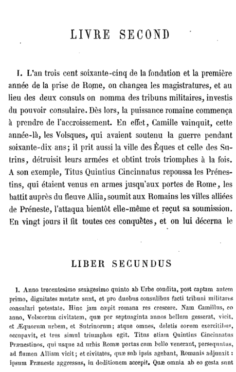 LIVRE SECOND [I] L’an trois cent soixante-cinq de la fondation et la première année de la prise de Rome, on changea les magistratures, et au lieu des deux consuls on nomma des tribuns militaires, investis du pouvoir consulaire. Dès lors, la puissance romaine commença à prendre de l’accroissement. En effet, Camille vainquit, cette année-là, les Volsques, qui avaient soutenu la guerre pendant soixante-dix ans; il prit aussi la ville des Èques et celle des Sutrins, détruisit leurs armées et obtint trois triomphes à la fois. A son exemple, Titus Quintius Cincinnatus repoussa les Prénestins, qui étaient venus en armes jusqu’aux portes de Rome, les battit auprès du fleuve Allia, soumit aux Romains les villes alliées de Préneste, l’attaqua bientôt elle-même et reçut sa soumission. En vingt jours il fit toutes ces conquêtes, et on lui décerna le triomphe. Toutefois, la dignité des tribuns milliaires ne fut pas de longue durée; en effet, peu de temps après, elle fut abolie et quatre ans se passèrent à Rome sans qu’il y eût des magistrats supérieurs. Cependant les tribuns militaires reprirent, avec la puissance consulaire, leur titre qu’ils conservèrent encore trois années. Puis les consuls furent nommés de nouveau. [II] Sous le consulat de L. Génucius et de Q. Servilius mourut Camile qui fat honoré comme un second Ro-mulus. T. Quintius créé dictateur, fut envoyé contre les Gaulois qui avaient envahi l’Italie. Ils s’étaient arrêtés à quatre milles de Rome, au delà du fleuve Anio. Là, un jeune sénateur, de la plus haute distinction, T. Manlius, provoqué par un Gaulois à un combat singulier, l’attaqua, le tua, lui enleva son collier d’or et le mit à son cou, ce qui fit donner à jamais à lui et à ses descendants le surnom de Torquatus. Les Gaulois furent chassés, et bientôt battus encore par le dictateur C. Sulpitius. Peu de temps après, les Toscans furent vaincus par C. Martius, et huit mille de leurs prisonniers furent conduits en triomphe. [III] On fit encore une fois le cens; et comme les Latins, soumis par le peuple de Rome, refusaient de fournir des soldats, le tirage eut lieu seulement parmi les Romains; on forma dix légions, ce qui portait à plus de soixante mille hommes le nombre des soldats: tant l’empire de Rome, malgré ses faibles ressources, déployait déjà d’héroïsme pour la guerre ! Ces troupes partirent contre les Gaulois, sous la conduite de L. Furius; et l’un des barbares ayant défié au combat le plus brave des Romains, M. Valérius, tribun militaire, se présenta; comme il s’avançait tout armé, un corbeau se posa sur son bras droit; puis, pendant le combat livré contre le Gaulois, le même corbeau frappa de ses ailes et de ses serres les yeux du barbare, pour l’empêcher de fixer devant lui ses regards. Ainsi le Gaulois, tué par le tribun Valérius, lui laissa et la victoire, et le surnom de Corvinus qu’on lui donna dans la suite; de plus, cette action d’éclat le fit nommer consul à vingt-trois ans. Les Latins, qui avaient refusé de fournir des soldats, exigèrent bientôt des Romains que l’un des consuls fût choisi parmi eux, et l’autre dans le peuple de Rome. On rejeta leur demande, on leur fit la guerre, ils furent vaincus dans une grande bataille, et leur entière défaite fournit un nouveau triomphe. En reconnaissance de cette vic-toire, des statues furent élevées aux consuls sur la place des Rostres. [Cette même année, Alexandre de Macédoine fonda Alexandrie.] [IV] Déjà la puissance romaine commençait à s’étendre; en effet, à cent trente milles de Rome à peu près, on faisait la guerre dans le pays des Samnites, qui tiennent le milieu entre le Picénum, la Campanie et l’Apulie. Lucius Papinus Cursor partit en qualité de dictateur pour cette expédition; obligé de revenir à Rome, il enjoi-gnit à Q. Fabius Maximus, maître de la cavalerie, qu’il laissait à la tête de l’armée, de ne pas livrer bataille en son absence. Toutefois Fabius, trouvant une occasion favorable, combattit avec le plus heureux succès, et défit les Samnites. Pour le punir de cette infraction à ses ordres, le dictateur le condamna à mort; mais l’armée et le peuple sa prononcèrent énergiquement en faveur de Fabius, le délivrèrent, et il s’éleva contre Papinus une telle sédition, qu’il fut lui-même presque en danger d’être tué. Dans la suite, les Samnites, sous le consulat de T. Vétunius et de Sp. Postumius, firent essuyer aux Romains la plus honteuse défaite, et les forcèrent de passer sous le joug. Cependant le sénat et le peuple rompirent le traité de paix que la nécessité avait fait conclure avec les ennemis, qui bientôt furent vaincus par le consul L. Papinus sept mille d’entre eux passèrent sous le joug, et Papinus triompha des Samnites. A cette époque, le censeur Appius Claudius fit construire l’aqueduc Claudien et paver la voie Appienne. [V] Les Samnites, ayant recommencé la guerre, battirent Q. Fabius Maximus et lui tuèrent trois mille hommes. Mais ensuite on lui donna pour lieutenant son père, Fabius Maximus, qui défit les Samnites et leur prit plu-sieurs villes de guerre. Enfin P. Cornélius Rufinus et Manius Curius Dentatus, tous deux consuls, envoyés contre les Samnites, les écrasèrent dans de grandes batailles. Ils terminèrent ainsi une guerre qui avait duré quarante-neuf ans; aucun ennemi, au sein de l’Italie, ne mit à de plus rudes épreuves la valeur romaine. Après quelques années d’intervalle, une nouvelle armée de Gaulois se joignit contre les Romains aux Toscans et aux Samnites; mais, tandis qu’elle marchait vers Rome, elle fut détruite par le consul Cn. Cornélius Dolabella. [VI] A la même époque, Rome, pour venger l’injure faite à ses ambassadeurs, déclara la guerre aux Tarentins, qui habitent les extrémités de l’Italie. Ce peuple appela à son secours, contre les Romains, Pyrrhus, roi d’Ép
