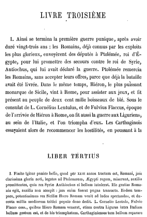 [I] Finito igitur Punico bello, quod per XXIII annos tractum est, Romani, jam clarissima gloria noti, legatos ad Ptolomaeum, Aegypti regem, miserunt auxilia promittentes, quia rex Syriae Antiochus ei bellum intulerat. Ille gratias Romanis egit, auxilia a Romanis non accepit : jam enim fuerat pugna transacta. Eodem tempore, potentissimus rex Siciliae Hiero Romam venit ad ludos spectandos, et ducenta millia modiorum tritici populo dono dedit. L. Cornelio Lentulo, Fulvio Flacco coss., quibus Hiero Romam venerat, etiam contra Ligures intra Italiam bellum gestum est, et de his triumphatum. Carthaginienses tum bellum reparare tentabant; Sardinienses, qui, ex conditione pacis, Romanis parere debebant, ad rebellandum impellentes. Venit tamen Romam legatio Carthaginiensium, et pacem impetravit. T. Manlio Torquato, C. Atilio Balbo coss. de Sardis triumphatum est; et, pace omnibus locis facta, Romani nullum bellum habuerunt : quod his, post Romam conditam, semel tantum Numa Pompilio regnante, contigerat. L. Postumius Albinus, Cn. Fulvius Centumalus coss. bellum contra Illyrios gesserunt; et, multis civitatibus captis, etiam reges in deditionem acceperunt : ac tum primum ex Illyriis triumphatum est. [II] L. Aemilio cos., ingentes Gallorum copiae Alpes transierunt : sed pro Romanis tota Italia consensit; traditumque est a Fabio historico, qui ei bello interfuit, DCCC millia hominum parata ad id bellum fuisse. Sed res per cos., tam prospere gesta est : XL millia hostium interfecta sunt, et triumphus Aemilio decretus. Aliquot deinde annis post, contra Gallos intra Italiam pugnatum est, finitumque bellum M. Claudio Marcello, Cn. Cornelio Scipione coss. Tunc Marcellus cum parva manu equitum dimicavit, et regem Gallorum, Viridomarum nomine, manu sua occidit. Postea cum collega ingentes copias Gallorum peremit, Mediolanum expugnavit, grandem praedam Romam pertulit; ac triumphans Marcellus spolia Galli, stipiti imposita, humeris suis vexit. M. Minucio, Rufo P. Cornelio coss., Istris bellum illatum est, quia latrocinati navibus Romanorum fuerant, quae frumenta exhibebant; perdomitique sunt omnes. [III] Eodem anno, bellum punicum secundum Romanis illatum est per Annibalem, Carthaginiensium ducem : qui Saguntum, Hispaniae civitatem, Romanis amicam, oppugnare agressus est, annum agens vicesimum aetatis, copiis congregatis CL miliumpeditum et XX millium equitum. Huic Romani per legatos denuntiaverunt, ut bello abstineret. Is legatos admittere noluit. Romani etiam Carthaginem miserunt; ut mandaretur Annibali, ne bellum contra socios populi Romani gereret. Dura responsa a Carthaginiensibus reddita. Saguntini interea fame victi sunt, captique ab Annibale ultimis poenis afficiuntur. Tum P. Cornelius Scipio cum exercitu in Hispaniam profectus est, Tiberius Sempronius in Siciliam, bellum Carthaginiensibus indictum est. [IV] Annibal relicto in Hispania fratre Hasdrubale, Pyrenaeum transiit; Alpes, adhuc ea parte invias, sibi patefecit. Traditur ad Italiam LXXX milia peditum et XX millia equitum, septem et XXX elephantos adduxisse. Interea multi Ligures et Galli Annibali se junxerunt. Sempronius Gracchus cognito ad Italiam Annibalis adventu, e Sicilia exercitum Ariminum trajecit. P. Cornelius Scipio Annibali primus occurrit : commisso proelio, fugatis suis, ipse vulneratus in castra rediit. Sempronius Gracchus et ipse confligit apud Trebiam amnem; is quoque vincitur. Annibali multi se in Italia dediderunt. Inde ad Tusciam veniens Annibal, Flaminio consuli occurrit; ipsum Flaminium interemit : Romanorum XXV millia caesa sunt; ceteri diffugerunt. Missus adversus Annibalem postea a Romanis Q. Fabius Maximus. Is eum, differendo pugnam, ab impetu fregit; mox, inventa occasione, vicit. [V] Quingentesimo et quadragesimo anno a condita Urbe, L. Aemilius Paulus P. Terentius Varro, contra Annibalem mittuntur, Fabioque succedunt : qui ambos consules monuit, ut Annibalem, callidum et impatientem ducem, non aliter vincerent, quam proelium differendo. Verum, quum impatientia Varronis consulis, contradicente altero, apud vicum, qui Cannae appellatur, in Apulia, pugnatum esset, ambo consules ab Annibale vincuntur. In ea pugna III milia Afrorum pereunt, magna pars de exercitu Annibalis sauciatur, nullo tamen punico bello, Romani gravius accepti sunt : periit enim in eo consul Aemilius Paulus, consulares aut praetorii XX; senatores capti aut occisi XXX, nobiles viri CCC, militum XL milia, equitum III milia et quingenti. In quibus malis nemo tamen Romanorum pacis mentionem habere dignatus est. Servi, quod numquam ante, manumissi et milites facti sunt. [VI] Post eam pugnam, multae Italiae civitates, quae Romanis paruerant, se ad Annibalem transtulerunt. Annibal Romanis obtulit, ut captivos redimerent : responsumque est a senatu eos cives non esse necessarios, qui quum armati essent, capi potuissent. Ille omnes postea variis suppliciis interfecit, et tres modios anulorum aureorum Carthaginem misit, quos e manibus equitum romanorum, senatorum et militum detraxerat. Interea in Hispania, ubi frater Annibalis Asdrubal remanserat cum magno exercitu, ut eam totam Afris subigeret, a duobus Scipionibus, Romanis ducibus, vincitur; perditque in pugna XXXV millia hominum; ex his capiuntur X millia, occiduntur XXV millia. Mittuntur ei a Carthaginiensibus ad reparandas vires XII millia peditum, IV millia equitum, XX elephanti. [VII] Anno quarto postquam ad Italiam Annibal venit, M. Claudius Marcellus consul apud Nolam, civitatem Campaniae, contra Annibalem bene pugnavit. Annibal multas civitates Romanorum per Apuliam, Calabriam, et Bruttios occupavit. Quo tempore etiam, rex Macedoniae Philippus ad eum legatos misit, promittens auxilia contra Romanos sub hac conditione ut, deletis Romanis, ipse quoque contra Graecos ab Annibale auxilia acciperet. Captis igitur legatis Philippi, et re cognita, Romani in Macedoniam M. Valerium Laevinum ire jusserunt; in Sardiniam T. Manlium Torquatum proconsulem : nam etiam ea sollicitata ab Annibale Romanos deseruerat. It
