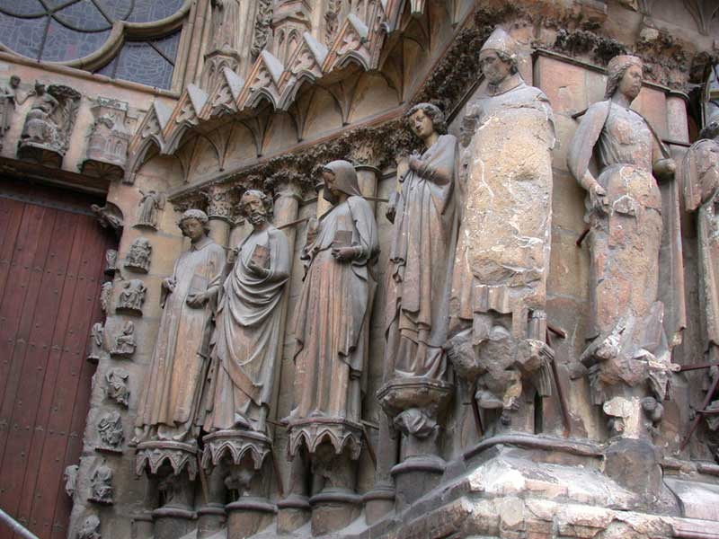 A droite, on trouve de l'intérieur vers l'extérieur, saint Etienne (?), saint Paul, la Vierge, saint Jean l'évangéliste et saint Rigobert (évêque). |