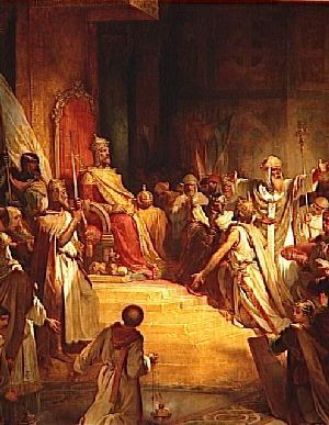 CHAPITRE IX. [1101.] L'an mil cent un de l'incarnation du Seigneur, le patriarche Daimbert et le comte Baudouin se réconcilièrent enfin, grâce à l'heureuse intervention de quelques hommes sages ; puis, le saint jour de Noël, le clergé et le peuple, les prélats des églises et les princes du royaume se réunirent dans l'église de Bethléem, et Baudouin y fut consacré roi, comme l'oint du Seigneur, et couronné solennellement du diadème royal par les mains du patriarche Daimbert. |