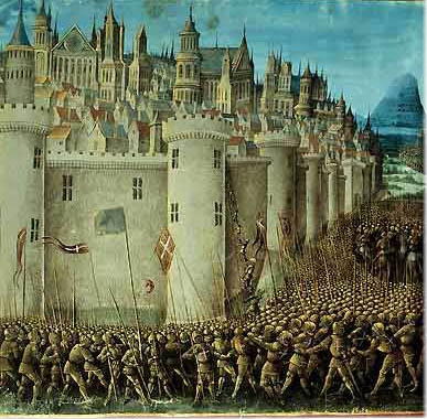 Les autres princes, voyant que ceux qui venaient de monter se trouvaient en assez grand nombre et étaient assez bien commandés pour pouvoir s'emparer d'une ou de plusieurs portes et les leur ouvrir, retournèrent au camp en toute bâte, à l'effet de disposer toutes leurs troupes, et de se tenir prêts à entrer dans la ville, aussitôt qu'on leur ferait les signaux convenus. Ceux qui étaient montés sur les remparts, recevant du ciel une force nouvelle, et marchant sous la conduite d'Émir -Feir, s'emparèrent successivement de dix tours placées dans le même quartier, â la suite l'une de l'autre, après avoir tué les gardes qui les occupaient, et cependant le calme le plus parfait régnait encore dans la ville, et l'on n'entendait encore aucun bruit. Il y avait de ce côté des remparts une porte bâtarde, vers laquelle les nôtres descendirent ; ils brisèrent les barreaux et les serrures qui la fermaient, et ouvrirent ainsi un passage à ceux qui les attendaient en dehors : ceux-ci se précipitèrent en foule et accrurent considérablement le cortège ; ils se rendirent de là à la porte du pont, se jetèrent avec impétuosité sur les gardiens qui y étaient préposés, les massacrèrent, et ouvrirent ainsi cette porte en la brisant. Pendant ce temps quelques hommes de la troupe de Bohémond avaient porté la bannière de leur chef sur la montagne qui domine la ville, et l'avaient plantée non loin de la citadelle supérieure, sur le point le plus élevé d'un petit fortin. L'horizon commençait à se rougir et annonçait l'arrivée prochaine du soleil ; aussitôt les soldats chrétiens, donnant le signal convenu à la porte de la ville, font retentir au loin les cors et les trompettes, et le bruit des instruments guerriers réveille tout le camp. Les princes reconnaissent les voix qui les appellent, ils courent aux armes, entraînent leurs bataillons, se précipitent dans la ville, et occupent les avenues et les portes. Tous les gens du peuple, en même temps, qui jusqu'alors avaient ignoré ce grand secret, se mettent en mouvement, ils voient déjà le camp presque désert, marchent à la suite des troupes, et se jettent de tous côtés dans la place. Les citoyens, réveillés enfin par tout ce tumulte, hésitent d'abord, et se demandent que veulent dire ces acclamations inusitées ; puis voyant courir de tous côtés des hommes cuirassés qu'ils ne connaissent point, entendant les mourants qu'on massacre dans les rues et sur les places publiques, ils découvrent enfin la vérité. Abandonnant aussitôt leurs demeures, avec leurs femmes et leurs enfants, cherchant à éviter les bandes d'hommes armés et à se cacher dans les lieux les plus secrets pour échapper à la mort, fuyant au milieu de ce désordre, et perdant bientôt toute présence d'esprit, ils se précipitent imprudemment dans les groupes mêmes des soldats. Les fidèles qui habitaient la ville, Syriens, Arméniens et de toute autre nation, se félicitent à l'envi d'un si heureux événement, prennent les armes et vont se réunir à leurs frères ; comme ils connaissaient mieux les localités, ils se mettaient à la tête des bataillons, les conduisaient dans tous les détours de la ville, aux portes qui demeuraient encore fermées et qu'ils ouvraient à tous les arrivants, après avoir tué ceux qui les gardaient. Il leur semblait que le Seigneur même leur accordait ce changement subit de fortune ; naguère ils s'étaient vus soumis à des chiens immondes, opprimés sous le joug d'une injuste servitude, écrasés sans miséricorde sous le poids de vexations et de tourments de toute espèce, et maintenant, par cet événement inespéré, ils pouvaient à leur tour rendre affronts pour affronts, et donner la mort à leurs persécuteurs. Déjà toute notre armée avait pénétré dans la ville et s'était librement emparée des portes, des tours et des remparts ; déjà les bannières et les enseignes des princes flottaient aux yeux de tous sur les points les plus élevés, et attestaient la victoire des Chrétiens. Le carnage et le deuil se répandaient de toutes parts ; on entendait de tous côtés les cris et les lamentations des femmes ; les chefs de famille étaient tués et toute leur famille succombait après eux ; on enfonçait les portes des maisons, on enlevait les meubles, tout ce qu'on y trouvait était la proie des premiers arrivants ; les vainqueurs se précipitaient dans des lieux jusqu'alors inaccessibles ; échauffés par le carnage, entraînés par la soif du pillage, ils n'épargnaient ni le sexe, ni le rang, ni l’âge, tout leur était indifférent. Dans leur emportement, ils demandent à ceux qu'ils rencontrent au milieu des rues, et sur les places publiques, où sont les demeures des plus puissants et des plus riches ; ils y courent en foule, massacrent les domestiques, pénètrent dans les asiles les plus secrets, percent de leurs glaives les enfants des nobles, les mères de famille, s'emparent dans les maisons de la vaisselle, de l'or, de l'argent, des vêtements précieux, et se distribuent ensuite ces riches dépouilles par égales portions. On dit qu'en ce jour il périt dans Antioche plus de dix mille habitants, et que toutes les rues étaient jonchées de cadavres tombés au hasard et privés de sépulture. |
