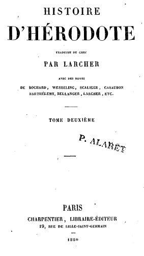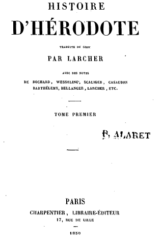 TABLE DU PREMIER VOLUME, Plan de l'Histoire d'Hérodote 6 CLIO. Les Perses. - Les Mèdes. - Babylone. - Crésus. - Solon. - Candaule et Gygès.- Cyrus. - Sémiramis. - Thomyris, etc. 41 EUTERPE. Égypte. - Isis. - Oracle de Dodone.' Sésostris. - Rhampsinite. - Héliopolis.- Éléphantine. - Le Nil - Embaumements. - Sépultures. - Les douze rois. - Psammitichus. -Wecos. - Psammis. -- Apriès. - Amasis, etc 135 THALIE. L'Égypte. - La Perse. - Cambyse. - Memphis. - Le boeuf Apis. - L'Éthiopie. - Polycrate.- Amasis. - Le faux Smerdis.- Darius. - Siége de Babylone, - Zopyre , etc 233 MELPOMÈNE La Scythie. - Hercule. - Les Gryphons.- Les hyperboréens.- Description de la terre. - Peuple de Scylax. - Usage des Scythes. Anacharsis. - Expédition de Darius. - Le Pont-Euxin. - Les Amazones. - Les Thraces - Les Gètes. - La Libye, - Culte du soleil, etc 316 TERPSICHORE. Suite de l'histoire de Darius. - Athènes et Sparte. - Les Pisistratides. - Cléomène. - Les statues d'Égine. - Origine de l'inimitié des Athéniens et des Éginètes. - Cypsélus, tyran de Corinthe. - Hippias. - Prise de Sardes par les Ioniens et les Athéniens. - Darius lance une flèche contre le ciel, en demandant aux dieux de se venger des Athéniens. - Toutes les villes de l'Hellespont, de l'Ionie et de l'Éolie sont soumises par les l'erses, etc 403 FIN DE LA TABLE DU PREMIER VOLUME.