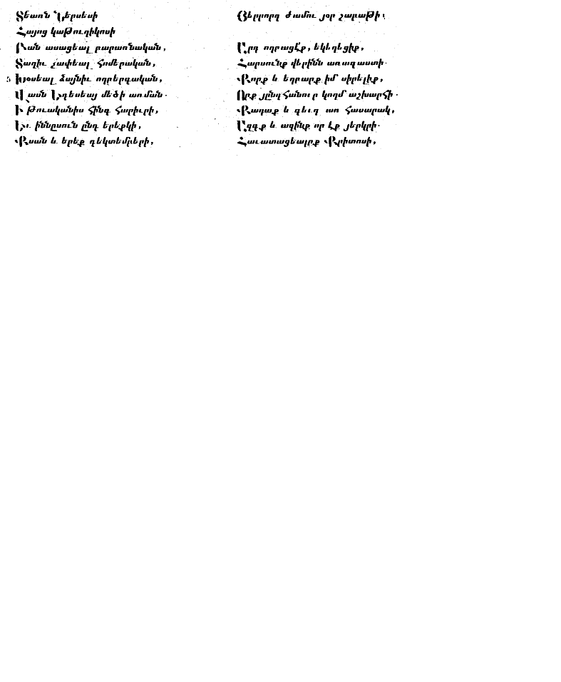 J'ai fait ma traduction vers par vers séparément, en conservant rigoureusement la coupe du mètre original et l'enchaînement des pensées, et en rendant avec autant de fidélité que possible le mouvement et les figures du style original. Malgré les tournures insolites en français auxquelles ce système de traduction m'a contraint parfois, et malgré la difficulté d'exprimer dans notre langue, si sobre et si contenue, les épithètes hardies et les synonymes variés a l'infini de la langue arménienne, on verra que ce poème est loin de mériter le jugement qu'en a porté, sur la foi de Chahan de Cirbied, Michaud qui, dans son Histoire des Croisades,[6] affirme que c'est une composition froide et diffuse.