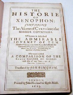 Tous les chefs de loches pressèrent alors Xénophon de conduire l'armée, et personne ne s'y opposa. Il se mit donc à la tête après avoir ordonné qu'on traversât le vallon sans se rompre, et chacun marchant droit devant soi. Il présumait qu'on se trouverait ainsi au-delà plus promptement et plus en force que s'il faisait défiler les Grecs sur un pont qui était au milieu du vallon. Quand on l'eut traversé, Xénophon longea la ligne et tint ce discours : « Soldats, rappelez à votre mémoire toutes les journées où, avec l'aide des Dieux, votre valeur vous a fait triompher ; et peignez-vous le sort qui attend ceux qui tournent le dos à l'ennemi ; songez aussi que nous sommes aux portes de la Grèce ; suivez Hercule conducteur et appelez-vous les uns les autres en vous exhortant à vous bien conduire. Que votre langage, que vos actions manifestent votre ardeur : il sera doux le les entendre célébrer par les hommes dont vous désirez les applaudissements. »