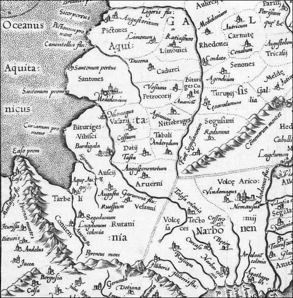 Le côté méridional touche à une partie de la Pyrènè et de la Narbonèsie; à la Narbonèsie, à partir de la source, du fleuve Liger jusqu'au dit point extrême dans le mont Pyrènè; à la Pyrènè, au couchant, dans la partie qui s'étend de là à la pointe d'OEaso. Les régions les plus septentrionales de l'Aquitanie, sur le fleuve et sur la mer, sont occupées par les Pictons, dont les villes sont :