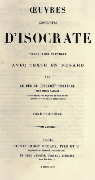 ŒUVRES COMPLÈTES D'ISOCRATE TRADUCTION NOUVELLE AVEC TEXTE EN REGARD LE DUC DE CLERMONT-TONNERRE (AIMÉ-MARIE-GASPARD) Ancien Ministre de la guerre et de la marine Ancien élève de l'École polytechnique TOME TROISIÈME PARIS LIBRAIRIE DE FIRMIN DIDOT FRÈRES, FILS ET Cie Imprimeur de l'Institut, rue Jacob, 56. ET CHEZ AUGUSTE DURAND, LIBRAIRE Rue des Grès. 7 M DCCC LXIV