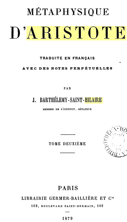 § 1. L'élément de la terre. Il ne faut pas être trop étonné de cette étrange physiologie, qui donne l'élément terreux pour la matière des sécrétions du corps humain. Voir encore un peu plus loin, § 4. - Où cette transformation. Le texte n'est pas aussi formel. La transformation est celle de l'élément terreux en un germe humain. - Comme en médecine. Cette idée de la médecine est amenée bien brusquement, et la comparaison n'apporte pas plus de clarté dans la pensée. - Par le médecin. J'ai ajouté ces mots. - Est guéri en puissance. L'expression n'est peut-être pas tout à fait juste; l'être est plutôt « guérissable » que guéri. § 2. La pensée. Ou, la libre volonté de l'homme. - A la réalité actuelle et complète. Le texte dit seulement « A l'Entéléchie ». - Pour reprendre l'exemple de l'être qui est guéri. J'ai dû développer ici le texte, pour que la pensée fût plus claire. - Que ce soit en lui. La remarque est sans doute exacte; mais il est vrai aussi que, pour que la guérison ait lieu, il faut tout à la fois qu'il n'y ait pas d'obstacle extérieur, non plus que d'obstacle intérieur. § 3. Quand on dit d'une maison qu'elle est en puissance. Le texte est encore ici moins développé que ma traduction. - Celui qui l'a conçue. L'expression grecque n'est qu'un pronom neutre, dont le sens est tout à fait indéterminé; j'ai cru devoir le préciser davantage. Mais Alexandre d'Aphrodise comprend ce passage autrement. Pour lui, le pronom neutre qu'emploie le texte ne signifie pas autre chose que la matière dont la maison sera faite, c'est-à-dire, les poutres, les pierres, les briques, etc. - Soit en puissance. Ou, plus simplement: « Soit possible ». - On peut en dire encore autant. La pensée n'est pas très claire, et il semble que ceci n'est qu'une répétition de ce qui a été dit plus haut, § 2. § 4. N'est pas encore en puissance. La pensée n'est peut-être pas très juste. La puissance existe indépendamment des circonstances extérieures, qui sont nécessaires à sa réalisation. - Le même principe. Il faudrait peut-être ajouter aussi « Et les mêmes conditions ». - De la terre. Même remarque que plus haut, § 1, sur cette singulière genèse, qui prend la terre pour le principe matériel de toutes choses. - Elle se change en airain. C'est sans doute parce que les métaux se trouvent dans la terre que l'on croyait qu'elle les produit. C'étaient là les théories de l'Antiquité. § 5. Il est fait de cette chose. Aristote forge ici un mot nouveau, que j'ai dû paraphraser. - N'est pas bois, mais il est en bois. L'exemple est fort clair; mais il est assez étrange, bien qu'au fond l'observation soit exacte, - Le coffre n'est pas en terre. Parce que la terre est l'élément dernier du bois; mais c'est le bois et non la terre qui, en puissance, est coffre; en d'autres termes, qui peut devenir coffre. § 6. On est arrivé à la matière première. Comme dans l'exemple précédent, la terre serait la matière première du coffre, parce qu'elle est par supposition l'élément du bois, dont le coffre est fait. Le texte remonte même plus haut dans l'exemple qui suit, et la matière première du coffre serait le feu, d'où vient l'air, qui donne naissance à la terre, comme la terre produit le bois dont le coffre est formé. Il est inutile encore une foie d'insister sur ces bizarres théories, qui, d'ailleurs, ont duré jusqu'au seizième siècle. § 7. C'est que l'un. C'est-à-dire, le sujet. - L'aube. C'est-à-dire, l'universel, le genre ou l'espèce. - C'est l'homme. Homme est encore un terme universel, bien qu'il le soit moins qu'Animal; il aurait mieux valu prendre un terme purement individuel : Socrate, Coriscus, ou tout autre. - De telle ou telle chose. Le texte répète ici le mot forgé que j'ai signalé plus haut, § 4 : « Le coffre est de bois ». § 8. C'est la substance. En d'autres termes, le sujet, qui reçoit les qualités et qui est individuel. Le terme dernier pourrait être appelé aussi le terme premier, selon que l'on commencerait la série par l'individu, en remontant jusqu'à l'universel, on selon que l'on descendrait de l'universel l'individu, comme l'auteur le fait ici. - De déterminer. Il y a des manuscrits qui ont ici une négation; mais le commentaire d'Alexandre d'Aphrodise ne connaît pas cette négation, et la plupart des éditeurs l'ont repoussée; ce qui ne veut pas dire qu'à un certain point de vue, il ne fût possible de la soutenir. - La matière et les qualités... sont indéterminées. Pour la matière, c'est toujours ainsi qu'Aristote la considère; pour les qualités, comme la blancheur, la rondeur, etc., elles sont indéterminées, en ce sens que ce sont des termes universels, applicables à une foule d'objets, sans être elles-mêmes des objets déterminés au sens réellement individuel. |