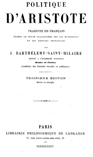 POLITIQUE D'ARISTOTE, TRADUITE EN FRANÇAIS D'APRÈS LE TEXTE COLLATIONNÉ SUR LES MANUSCRITS ET LES ÉDITIONS PRINCIPALES PAR J. BARTHÉLEMY-SAINT HILAIRE, DEPUTÉ A L'ASSEMBLÉE NATIONALE, MEMBRE DE L'INSTITUT (ACADÉMIE DES SCIENCES MORALES) , TROISIÈME ÉDITION, Revue et corrigée), PARIS, LIBRAIRIE PHILOSOPHIQUE DE LADRANGE, 41, RUE SAINT-ANDRE-DES-ARTS, 41, MDCCCLXXIV.