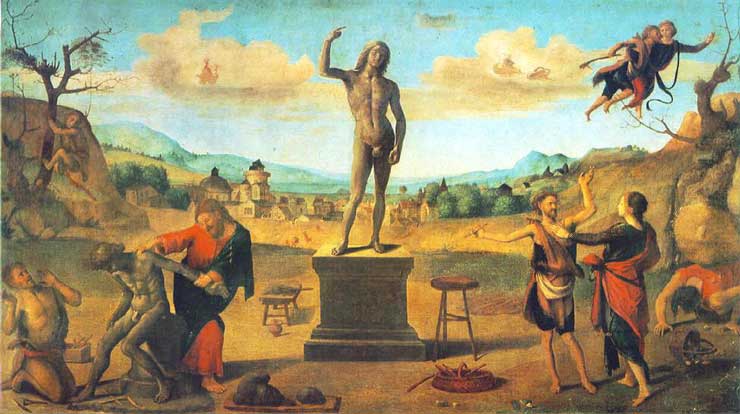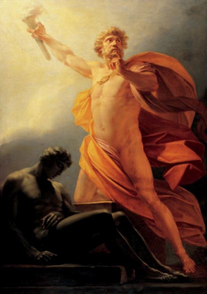 Il fut un temps où les dieux existaient, et où il n'y avait point [320d] encore d'êtres mortels. Lorsque le temps de leur existence marqué par le destin fut arrivé, les dieux les formèrent dans le sein de la terre, les composant de terre, de feu, et des autres éléments qui se mêlent avec le feu et la terre. Quand ils furent sur le point de les faire paraître à la lumière, ils chargèrent Prométhée et Épiméthée (21) du soin de les orner, et de pourvoir chacun d'eux des facultés convenables. Épiméthée conjura son frère de lui laisser faire cette distribution. Quand je l'aurai faite, dit-il, tu examineras si elle est bien. Prométhée y ayant consenti, il se met à faire le partage : il donne aux uns la force sans vitesse, [320e] compense la faiblesse des autres par l'agilité; arme ceux-ci, et à ceux-là qu'il laisse sans défense il réserve quelque autre moyen d'assurer leur vie ; les petits reçoivent des ailes, ou une demeure souterraine ; et ceux qui ont la grandeur en partage, il les [321a] met en sûreté par leur grandeur même. Il suit le même plan et la même justice dans le reste de la distribution, pour qu'aucune espèce ne soit détruite. Après avoir pris les mesures nécessaires pour empêcher leur destruction mutuelle, il s'occupe des moyens de les faire vivre sous les diverses températures, en les revêtant d'un poil épais et d'une peau ferme, qui pussent les défendre contre le froid et la chaleur, et tinssent lieu à chacun de couvertures naturelles, quand ils se retireraient pour dormir. De plus, [321b] il leur met sous les pieds, aux uns une corne, aux autres des calus et des peaux très épaisses et dépourvues de sang. Il leur fournit ensuite des aliments de différente espèce, aux uns l'herbe de la terre, aux autres les fruits des arbres, à d'autres des racines. La nourriture qu'il destina à quelques-uns fut la substance même des autres animaux. Mais il fit en sorte que ces bêtes carnassières multipliassent peu, et attacha la fécondité à celles qui devaient leur servir de pâture, afin que leur espèce se conservât. Comme Épiméthée n'était pas fort habile, il ne s'aperçut pas [321c] qu'il avait épuisé toutes les facultés en faveur des êtres privés de raison. L'espèce humaine restait donc dépourvue de tout, et il ne savait quel parti prendre à son égard. Dans cet embarras, Prométhée survint pour jeter un coup-d'œil sur la distribution. Il trouva que les autres animaux étaient partagés avec beaucoup de sagesse, mais que l'homme était nu, sans chaussure, sans vêtements, sans défense. Cependant le jour marqué approchait, où l'homme devait sortir de terre et paraître à la, lumière. Prométhée, fort incertain sur la manière dont il pourvoirait à la sûreté de l'homme, prit le parti de [321d] dérober à Vulcain et à Minerve les arts et le feu : car sans le feu la connaissance des arts serait impossible et inutile ; et il en fil présent à l'homme. Ainsi notre espèce reçut l'industrie nécessaire au soutien de sa vie ; mais elle n'eut point la politique, car elle était chez Jupiter, et il n'était pas encore au pouvoir de Prométhée d'entrer dans la citadelle, séjour de Jupiter, devant laquelle [321e] veillaient des gardes redoutables. Il se glisse donc en cachette dans l'atelier où Minerve et Vulcain travaillaient en commun, dérobe l'art de Vulcain, qui s'exerce par le feu, avec les autres arts propres à Minerve, et les donne à l'homme ; voilà comment l'homme a le moyen [322a] de subsister. Prométhée, à ce qu'on dit, porta dans la suite la peine de son larcin, dont Épiméthée avait été la cause. L'homme ayant donc quelque part aux avantages divins, fut aussi le seul d'entre les animaux qui, à cause de son affinité avec les dieux, reconnut leur existence, conçut là pensée de leur dresser des autels, et de leur ériger des statues. Ensuite il trouva bientôt l'art d'articuler des sons, et de former dès mots; il se procura une habitation, des vêtements, une chaussure, de quoi se couvrir la nuit, et tira sa nourriture de la terre. Ainsi pourvus du nécessaire, [322b] les premiers hommes vivaient dispersés, et les villes n'existaient pas encore. C'est pourquoi ils étaient détruits par les bêtes, étant trop faibles à tous égard pour leur résister : et leurs arts mécaniques, qui suffisaient pour leur donner de quoi vivre ne suffisaient point pour combattre les animaux; car ils ne connaissaient pas encore l'art politique, dont celui de la guerre fait partie. Aussi ils cherchaient à se rassembler, et à se mettre en sûreté en bâtissant des villes ; mais, lorsqu'ils étaient réunis, ils se nuisaient les uns aux autres, parce que la politique leur manquait, de sorte que, se dispersant de nouveau, ils devenaient la proie des bêtes féroces. [322c] Jupiter, craignant donc que notre espèce né pérît entièrement, envoya Mercure pour faire présent aux hommes de la pudeur et de la justice, afin qu'elles missent l'ordre dans les villes, et resserrassent les liens de l'union sociale. Mercure demanda à Jupiter de quelle manière il devait taire la distribution de la justice et de la pudeur. Les distribuerai-je comme on a fait les arts ? or les arts ont été distribués de cette manière : la médecine a été donnée à un seul pour l'usage de plusieurs qui n'en ont aucune connaissance, et de même par rapport aux autres artisans. Suivrai-je la même règle dans le partage de la justice et de la pudeur, [322d] ou les distribuerai-je entre tous? Entre tous, repartit Jupiter ; et que tous y aient part. Car si la distribution s'en fait entre un petit nombre, comme celle des autres arts, jamais les villes ne se formeront. De plus, tu leur imposeras de ma part cette loi, de mettre à mort quiconque ne pourra participer à la pudeur et à la justice, comme un fléau de la société.