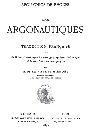 CHANT III (Bilingue) (744-fin) — Après de longues hésitations, Médée se dispose a porter à Jason les substances magiques (744-824). — Médée va avec ses suivantes au temple d'Hécate pour y rencontrer Jason (829-911). — Jason s'y rend de son côté; entrevue du héros avec la jeune fille (912-1145). — Retour de Médée dans sa. maison (1146-1162). — Aiétès remet les dents du dragon aux envoyés de Jason (1163-1190). — Jason offre un sacrifice nocturne a Hécate (1191-1224). — Aiètés se dispose à aller assister a la lutte de Jason contre les taureaux (1225-1245). — Jason se prépare à la bataille (1246-1277). — Jason met les taureaux sous le joug et force les géants à se tuer entre eux (1278-1407).