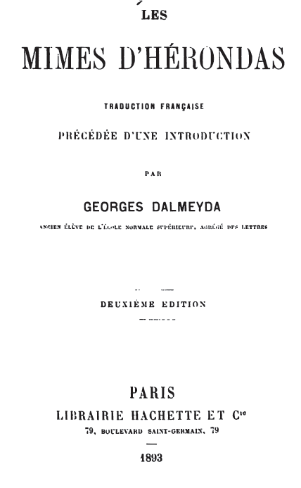 FINAPPENDICENOTES ET ÉCLAIRCISSEMENTSNous avons suivi dans la traduction de ces mimes les éditions Buecheler (Bonn, 1892) et Crusius (Leipzig, Teubner, 1892), particulièrement cette dernière, qui est la plus récente. Les amis du poète grec doivent être reconnaissants au savant professeur de Tubingue, à qui nous devons de nouvelles lectures, faites sur l’autotype, et plusieurs bonnes conjectures. Nous nous sommes quelquefois écartés de son texte, quand les suppléments qu’il propose nous ont paru trop hardis, ou quand les leçons de la seconde main nous ont semblé préférables à celles de la première. Nous avons aussi profité des récentes lectures faites par Blass, sur le papyrus même, au British Museum (Göttingische Gelehrte Anzeigen, 1892, n° 22, p.857 sqq.), et des suppléments proposés par Diels dans ses essais de restitution des sixième et septième mimes (Sitzungsberichte der Akademie zu Berlin, 1892, I, p. 387 sqq.) Nous indiquons d’ailleurs, dans les notes placées en appendice, les passages où nous nous écartons du texte de l’édition Crusius. Pour l’intelligence du texte, nous avons souvent consulté, outre la traduction latine et les excellents commentaires de l’édition Buecheler, les Recherches de Crusius (Untersuchungen zu den Mimiamben des Herondas, Leipzig, Teubner, 1892). L’auteur de cet ouvrage met au service des lecteurs d’Hérondas sa vaste érudition et sa connaissance particulière des parémiographes grecs. Enfin, parmi les études publiées en France, nous avons lu avec profit : trois articles de Henri Weil (Journal des Savants, cahiers de novembre 1891, d’août 1892 et de janvier 1893) et un article de Théodore Reinach (Revue des Études grecques, t. 1V, 1891, 15, p. 209 sqq.), qui a traduit d’une façon vive et piquante plusieurs morceaux des mimes. MIME 1[1] Excellent roi: c’est Ptolémée III Evergète; son règne va de 247 à 226. [2] Que l’on tourne ailleurs ses regards : nous traduisons le supplément proposé par Weil, πάπτη]νον ἄλλῃ. [3]. Sur une seule ancre. Les trois vers qui suivent sont trop mutilés pour qu’on puisse les restituer d’une façon vraisemblable. Crusius introduit fort étrangement l’idée de la mort (l’ennemi commun?) et donne des mots μηδὲ εἷς ἀναστήσῃ une explication inadmissible. Buecheler entend : nec quisquam excitet (sollicitetve); c’est forcer le sens de ἀναστήσῃ. Peut-être faudrait-il entendre par ce dernier mot, non pas excitet, mais recreet ; le sens serait alors « un nouvel ami, si l’orage éclate, et que nul ne te ranime, sera là pour te protéger. » Mais ce sont là de simples conjectures, peu conciliables avec les lectures de Blass. [4] Parle aux jeunes femmes.... Blass, dans son récent examen du papyrus, a lu, non μιτρηίαισι (texte de Buecheler) mais μετρηταῖσι (texte de Crusius), mais ὃν δὲ γρῄαισι πρ. γυν. τ. ν. ἀ. Nous avons profité de cette dernière lecture. [5] La fin du vers est très mutilée: nous hasardons un sens probable. [6] Myrtalé et Simé sont sans doute de jeunes pensionnaires de l’entremetteuse. MIME II[1] Mon pauvre pain. Κοὐδέ est inadmissible. Nous suivons le texte de Buecheler : ἐγὼ δ'ἐμοὺς ἄρτους. [2] Après l’avoir maltraité. Suivent 10 vers qu’il est presque impossible de restituer. Les suppléments proposés par Crusius ne s’accordent plus avec les lectures de Blass. Battaros, si grossier qu’on le suppose, ne peut être assez maladroit pour déclarer aux juges « qu’il les enverra promener » ou « qu’il les plantera là », ὑμέας κλαῦσαι λέγων. La répétition de καὶ οὐ ζ]ῶμεν serait bien lourde; enfin nous comprenons fort mal ce que le leno dit d’Aristophon, de Mennès et de Philisteus. [3] Quand je suis venu.... Nous suivons encore ici la lecture de Blass