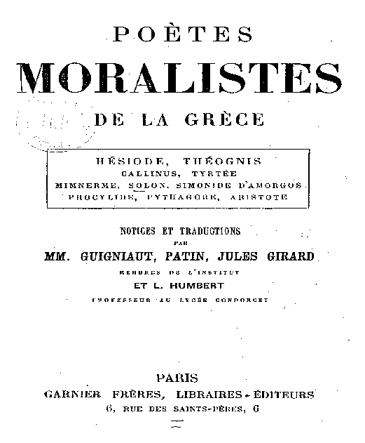 NOTICE SUR SIMONIDE D'AMORGOSPar M. HUMBERT Simonide d'Amorgos, fils de Crinès, vivait dans le viie siècle avant Jésus-Christ. Il était né à Samos, mais il ne resta pas dans cette ville. Il conduisit une colonie dans l'île d'Amorgos, une des Cyclades, et y fonda trois villes, Minoa, Aegialus et Arcésine; c'est dans cette dernière qu'il semble avoir établi sa résidence. Plus jeune qu'Archiloque, il composa, après lui, et avant Hipponax, des vers iambiques. Il nous reste de ce Simonide, qui mérite d'avoir sa place parmi les moralistes, un assez long poème sur les femmes, sorte de boutade, parfois un peu rude et grossière, où l'on trouve de l'imagination, de la force et une sorte de gravité naïve. Simonide d'Amorgos a souvent été confondu avec son illustre homonyme, Simonide de Céos, qui vivait plus d'un siècle après lui. Pendant longtemps les deux fragments des deux poètes ont été mêlés, et c'est ainsi qu'ils se trouvent dans les recueils que nous avons déjà cités, et en particulier dans le Sylloge poetarum graecorum, de M. Boissonade. Welcker est le premier qui les ait séparés et qui ait donné une édition séparée de Simonide d'Amorgos (Bonn, 1835, in 8°). POÈME SIMONIDE D'AMORGOSTRADUIT Par M. HUMBERT
