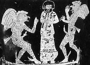 280-392 : les charbonniers attaquent Dicéopolis mais, menaçant de poignarder un sac de charbon, notre héros parvient à désarçonner les Acharniens.