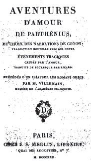 Des cinquante récits de Conon que le laborieux patriarche d'Alexandrie nous a conservés abrégés dans sa bibliothèque, les uns sont des extraits trop courts pour offrir aucun intérêt; les autres ne traitent que des sujets de mythologie qu'on rencontre dans tous les auteurs, et dont quelques uns même se trouvent déjà dans Parthénius. Nous en avons traduit six qui nous ont paru assez piquants pour ne pas déparer la petite collection dont se compose notre volume.
