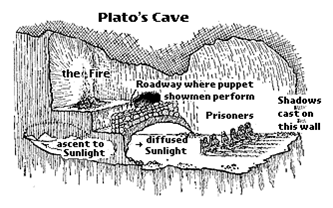 Figure-toi des hommes dans une demeure souterraine, en forme de caverne, ayant sur toute sa largeur une entrée ouverte à la lumière; ces hommes sont là depuis leur enfance, les jambes et le cou enchaînés, de sorte qu'ils ne peuvent bouger ni voir ailleurs que