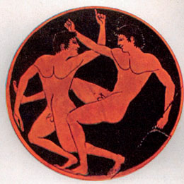 CHAPITRE X. [1] Ἐπὶ δὲ τοῖς κατειλεγμένοις ἕστηκεν ὁ Καρύστιος Γλαῦκος. Εἶναι δέ φασιν ἐξ Ἀνθηδόνος τῆς Βοιωτῶν τὸ ἄνωθεν αὐτὸν γένος ἀπὸ Γλαύκου τοῦ ἐν θαλάσσῃ δαίμονος. Πατρὸς δὲ οὗτος ὁ Καρύστιος ἦν Δημύλου, καὶ γῆν φασιν αὐτὸν κατ' ἀρχὰς ἐργάζεσθαι. Ἐκπεσοῦσαν δὲ ἐκ τοῦ ἀρότρου τὴν ὕνην, πρὸς τὸ ἄροτρον καθήρμοσε τῇ χειρὶ ἀντὶ σφύρας χρώμενος. Καί πως [2] ἐθεάσατο ὁ Δημύλος τὸ ὑπὸ τοῦ παιδὸς ποιούμενον, καὶ ἐπὶ τούτῳ πυκτεύσοντα ἐς Ὀλυμπίαν αὐτὸν ἀνήγαγεν. Ἔνθα δὴ ὁ Γλαῦκος, ἅτε οὐκ ἐμπείρως ἔχων τῆς μάχης, ἐτιτρώσκετο ὑπὸ τῶν ἀνταγωνιζομένων, καὶ ἡνίκα πρὸς τὸν λειπόμενον ἐξ αὐτῶν ἐπύκτευεν, ἀπαγορεύειν ὑπὸ πλήθους τῶν τραυμάτων ἐνομίζετο. Καί οἱ τὸν πατέρα βοῆσαί φασιν· Ὦ παῖ τὴν ἀπ' ἀρότρου. Οὕτω γε δὴ βιαιοτέραν ἐς τὸν ἀνταγωνιζόμενον ἐνεγκὼν τὴν πληγὴν, αὐτίκα εἶχε τὴν νίκην. [3] Στεφάνους δὲ λέγεται καὶ ἄλλους Πύθια μὲν δὶς λαβεῖν, Νεμείων δὲ καὶ Ἰσθμίων ὀκτάκις ἐν ἑκατέρῳ ἀγῶνι. Τοῦ Γλαύκου δὲ τὴν εἰκόνα ἀνέθηκε μὲν ὁ παῖς αὐτοῦ, Γλαυκίας δὲ Αἰγινήτης ἐποίησε· σκιαμαχοῦντος δὲ ὁ ἀνδριὰς παρέχεται σχῆμα, ὅτι ὁ Γλαῦκος ἦν ἐπιτηδειότατος τῶν κατ' αὐτὸν χειρονομῆσαι πεφυκώς. A la suite de toutes les statues dont je viens de parler, est celle de Glaucus de Carystos. Il était, à ce qu'on dit, originaire d'Anthédon, ville de la Béotie, et descendait de Glaucus, l'un des dieux marins. Glaucus de Carystos était fils de Démylus. Il commença d'abord, dit-on, par travailler à la terre; le soc de sa charrue s'étant un jour démanché, il le rajusta en se servant de sa main comme d'un marteau. Démylus voyant ce que faisait son fils, le conduisit à cause de cela à Olympie pour y combattre au pugilat. A son arrivée Glaucus, qui ne connaissait point du tout l'art de combattre, reçut des coups de ses antagonistes, et lorsqu'il en fut aux mains avec le dernier, on crut qu'il allait renoncer au prix à cause du grand nombre de ses blessures. On dit qu'alors son père lui cria : enfant, frappe comme sur la charrue. Alors Glaucus porta un coup si violent à son adversaire qu'il remporta sur le champ la victoire. On ajoute qu'il obtint dans la suite d'autres prix, savoir; deux aux jeux pythiques, huit aux jeux néméens, et autant aux jeux isthmiques. La statue de Glaucus fut placée à Olympie par son fils; elle est l'ouvrage de Glaucias d'Égine. Il y est représenté agitant les bras comme pour s'exercer; car il fut, à ce qu'on prétend, l'homme le plus habile de son temps à régler les mouvements de ses mains.