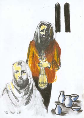 LABOUREUR ÉLECTRE Ils se dissimulent. Électre, une amphore sur la tête, revient vers la chaumière en chantant. |