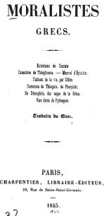 économiquelettre à Alexandre sur le monde (bilingue) TERMINé - marche des animaux (bilingue) - problèmes (bilingue) - réfutation des Sophistes (bilingue) terminé - parties des animaux (bilingue) en cours - météorologie (bilingue) - traité du ciel - morale à eudème (bilingue) - grande morale (bilingue) - problèmes musicaux - la rhétorique - - la constitution d'athènes. - la physique. (+ texte grec) - la politique (texte grec en cours d'installation) (les 8 livres terminés) - la poétique (texte bilingue - texte français seul - texte grec seul) - de l'âme (autre tRAduction de BarThélemy-Saint-Hilaire avec texte grec et notes) - métaphysique (BILINGUE) (livres I, IV, V, VII, VIII, IX, X, XI, XII, XIII, XIV) la suite en cours - de la génération et de la corruption terminé - topiques (I, II, III, IV, V VI, VII et VIII) + texte grec (en cours) - premiers analytiques - Derniers analytiques + texte grec - Histoire des Animaux + texte grec (en cours) - catégories (bilingue) terminé - herméneia - DE MELISSUS, DE XENOPHANE ET DE GORGIAS - OPUSCULES - DE LA MÉMOIRE ET DE LA RÉMINISCENCE. (bilingue) - DU PRINCIPE GÉNÉRAL DU MOUVEMENT DANS LES ANIMAUX (BILINGUE) - traité de la respiration - traité des rêves (bilingue) - Traité de la divination dans le sommeil (bilingue) - Traité du sommeil et de la veille (bilingue) - Traité de la sensation et des choses sensibles (bilingue) - Traité de la jeunesse, de la vieullesse; de la vie et de la mort - (billingue) - éthique de Nicomaque + Mr. Thurot : DISCOURS PRÉLIMINAIRE, ou INTRODUCTION A LA MORALE D'ARISTOTE. - Pierron, Alexis - Histoire de la littérature grecque - ARISTOTE